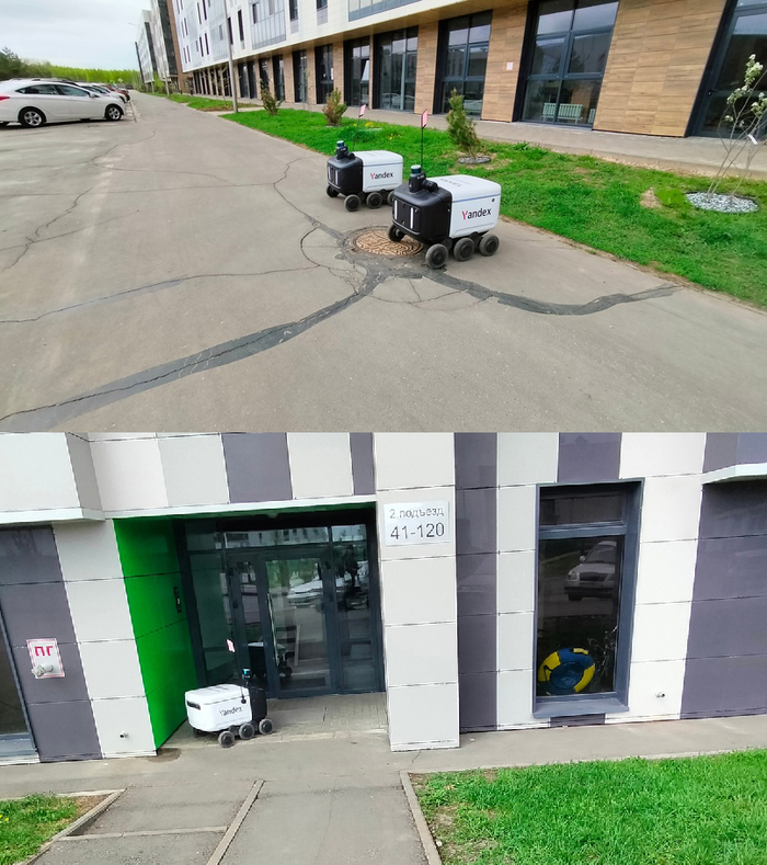 Роверы Яндеск-доставки. Не бутафория. действительно катаются везде по заказам. Но только до подъезда. Кожаные мешки должный спускаться за едой самостоятельно.