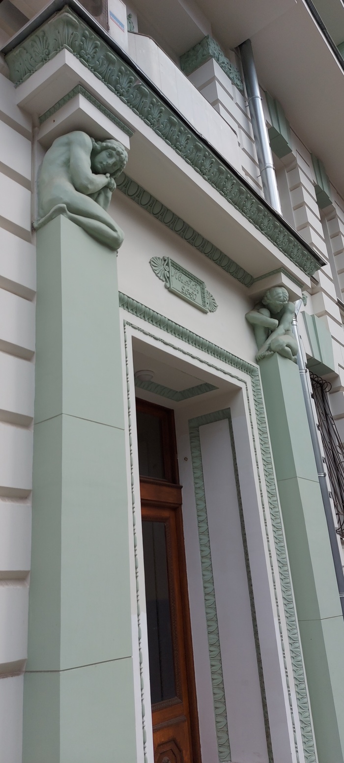 Дом примечателен обилием разнообразной лепнины. Здесь и атланты, и путти, и бараньи головы, всего понемногу.