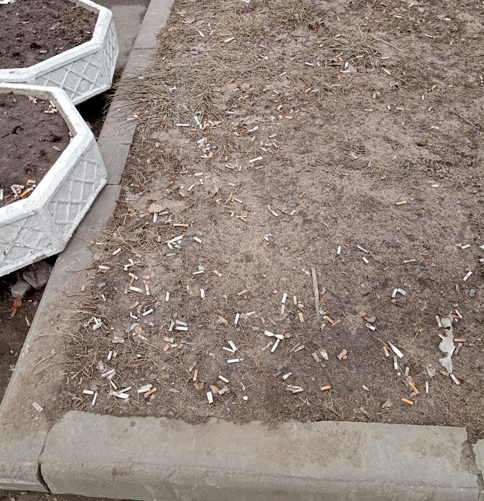 Сотрудники оборудовали себе место для курения. Пепельница - банка из-под краски привязанная к кабелю, выходящему из подвала. Помойка там была перманентная.