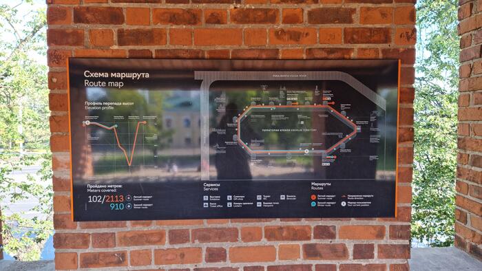 Начинается прогулка по Кремлёвской стене! Инфотабло обещает 2113 метров впечатлений.