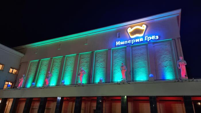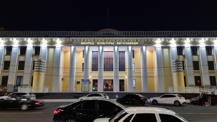 Темнело. День получился очень интересным и насыщенным, и я решил, что пора возвращаться в место моего ночлега, до которого, к тому же, ещё предстояло добраться. Проехав часть пути на самокате, а затем на метро, я вышел из подземки и, прежде чем снова оседлать самокат, полюбовался ночным зданием кинотеатра под интригующим названием “Империя грёз” и монументальным дворцом культуры автозавода.