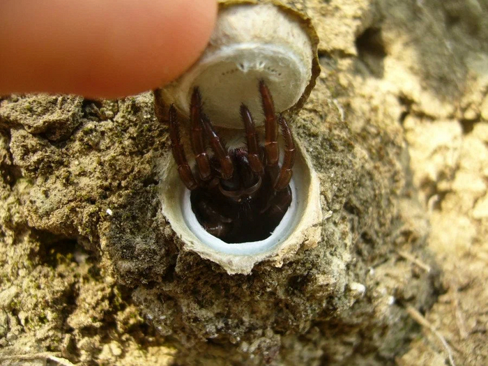 Паук-каменщик хитёр даже по меркам других засадных пауков. Нормальные восьминогие развешивают ловчие сети и ждут пролетающего мимо насекомыша. Их мочит дождь, треплет ветер и жжёт солнце. А каменщик сидит себе в уютном доме и ему комфортно.
