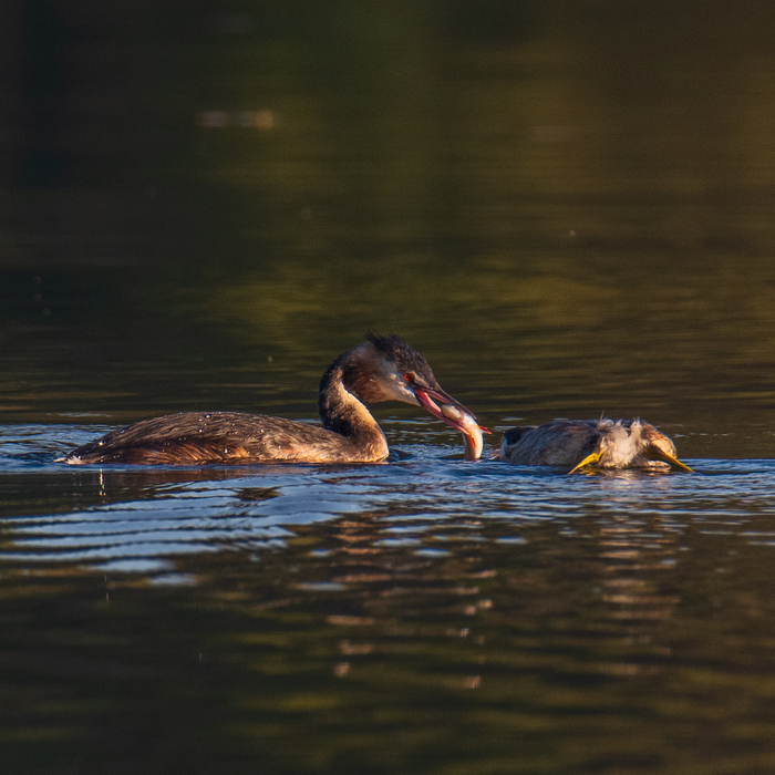 Давно не брал я в руки шашек фотоаппарат. Но вчера утром, проснувшись, подумал, что раз по прогноз обещает последний теплый солнечный день, то надо бы сходить, выгулять технику. На озеро пришел в районе 7:30. Летом в это время (а то и раньше, часов в шесть), уже вся живность вовсю активничает, а сейчас птицы еще не все проснулись. Только лысухи суетятся то там, то тут, да часть уток, разбуженная разговорами людей, приплыла на станцию моржевания (моржи тоже рано приходят купаться, и от них обычно птицам что-то перепадает). А чомг сегодня было только две, и они дрейфовали в центре озера, то пытаясь спать, то прихорашиваясь, то снова засовывали голову под крыло. Но далеко для нормальных снимков. Некоторое время спустя я уж было решил пойти поискать счастья в другой локации, как озеро огласил писк проголодавшегося чомужонка. И рыбалка началась ) Птенец теперь ныряет наравне с родителем, и по расстоянию, и по времени нахождения под водой. Вот только безрезультатно. Пришлось ему, как обычно, выпрашивать еду у взрослого
