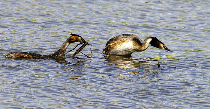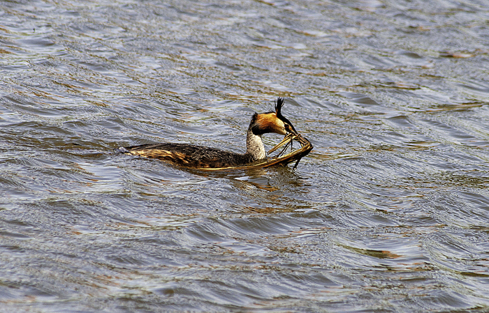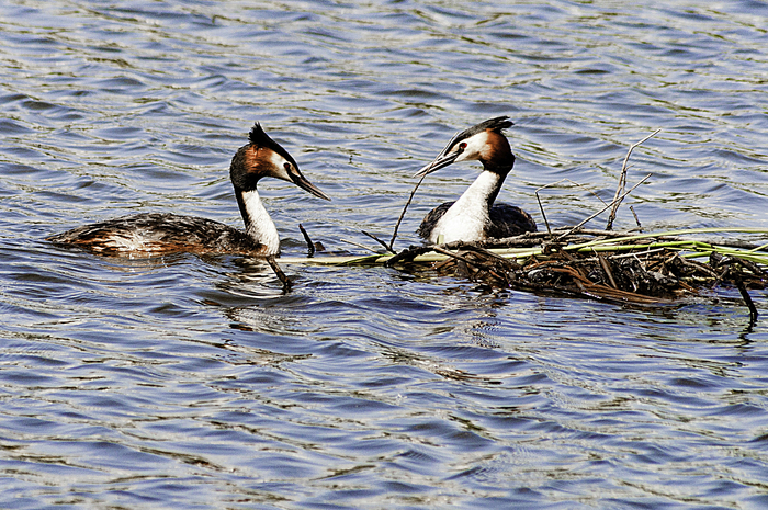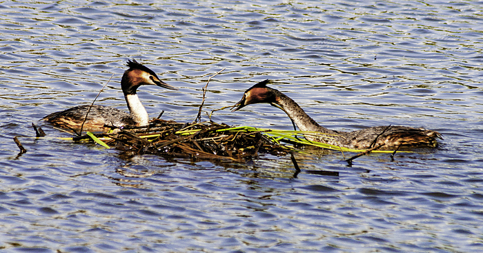 Гнездо чомг едва видно над водой, оно, фактически, затонуло и пара издавала довольно скорбные звуки.