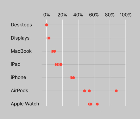 После подсчёта баллов вырисовалась четкая закономерность. Прикладные настольные продукты - 0 %. Дисплеи - от 2 % до 3 %. Макбуки - от 7 % до 10 %. Айпады - от 12 % до 18 %. Айфоны - около 33 %.