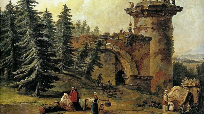 Тут она вытащила из другой комнаты сверток, метра полтора длиной и развернула. Перед нами оказалась действительно нарисованная когда-то давно картина, елки на ней и разрушенная башня.
