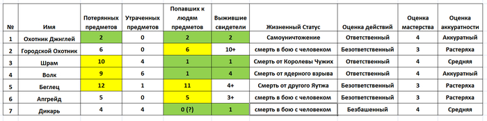 Итак номинации Самый ответственный Хищник - Волк. Самый безответственный - Беглец. Мистер Растеряха - Беглец - к людям попали 11 предметов Мистер Бережливость - Волк/Шрам - к людям попал 1 предмет