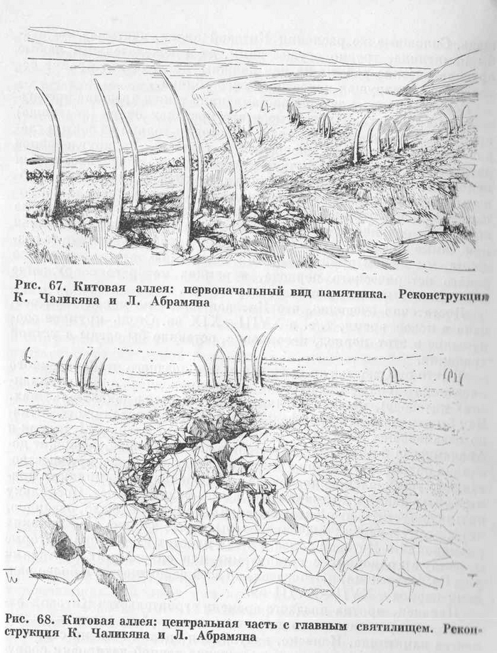 Столбы стояли на протяжении почти полукилометра вдоль берега, поодиночке, группами по два, целыми скоплениями — несколько десятков огромных, больше пяти метров высотой, челюстных костей гренландских китов. На вершинах их видны зарубки и отверстия, очевидно для привязывания каких-то предметов. Да, столбы из китовых челюстей довольно обычны для старых эскимосских селений, так как на них держались и стены землянок, и помосты для хранения байдар, и сушила для мяса, но обычно их высота не превышала двух метров, и нигде они не встречались в таких количествах.