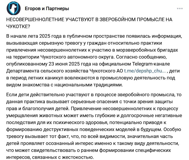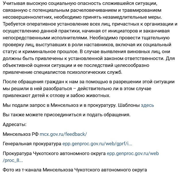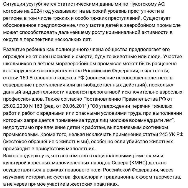 Ему, видите ли, их национальные традиции не понравились, а именно морской промысел. Всё приплёл зоо-SJW: и вовлечение детей в преступную деятельность, и свою любимую 245-ю статью, и уровень преступности на Чукотке.