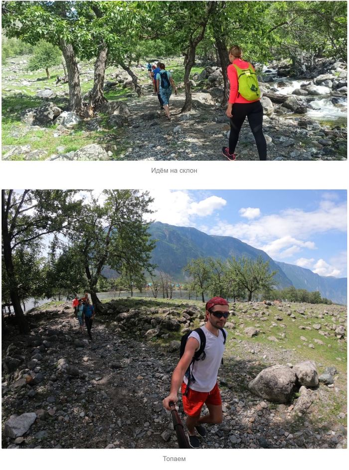 Переправившись, идем по живописному каменистому берегу к склону горы. Среди камней растут деревца и протекает холодный ручей, в который приятно забраться в жаркую погоду.