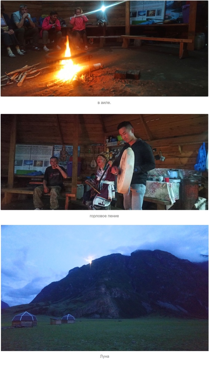 Вечером Андрей и Надя собрались сходить послушать горловое пение. Еще днём Олег Асканаков раздавал рекламные буклеты, приглашая вечером к себе в аил. Остальные же не захотели никуда идти, а стали готовиться к завтрашнему дню и укладываться спать.