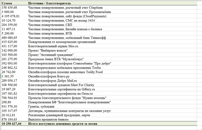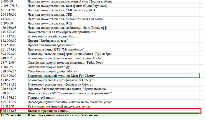 Мы видим, что деньги на баланс пришли путем частных пожертвований, пожертвований от участия в разных благотворительных программах, и от муниципалитета на ОСВВ.