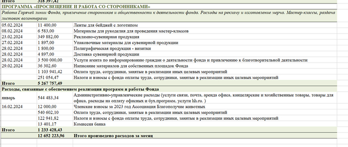 А на что были потрачены? смотрим отчет за февраль 2024, и в нем видим траты на работу по программе “просвещение и работа со сторонниками”