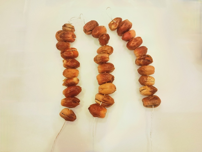 Финики режем вдоль, извлекаем косточку, на ее место помещаем ядро миндаля. Нанизываем на веревочку.