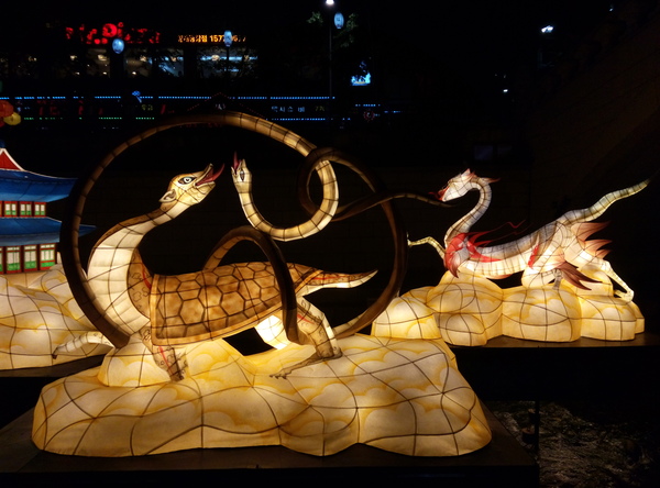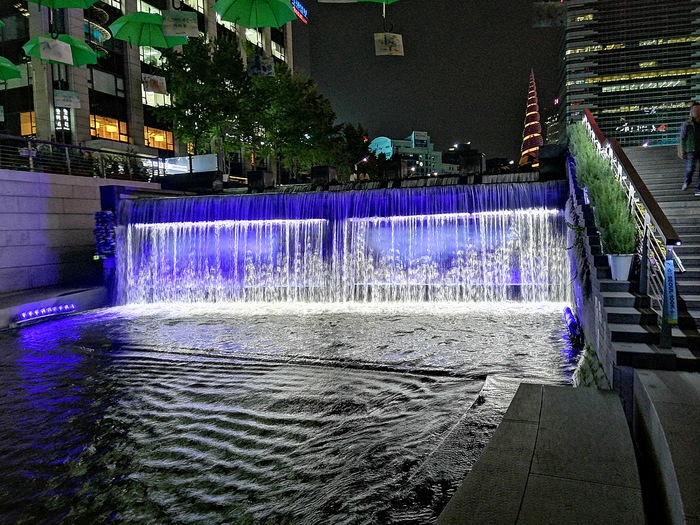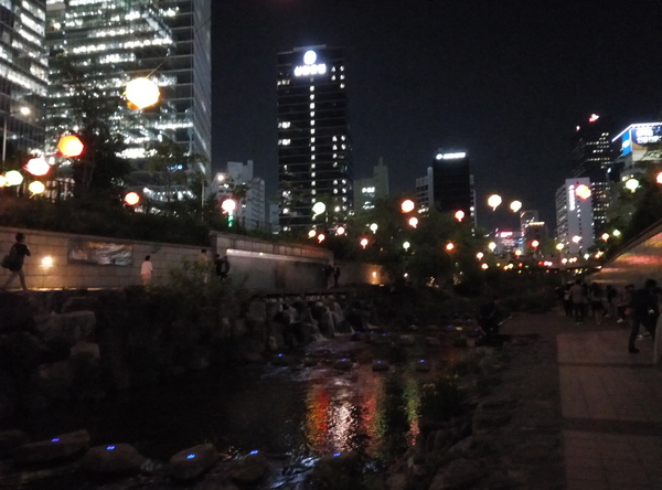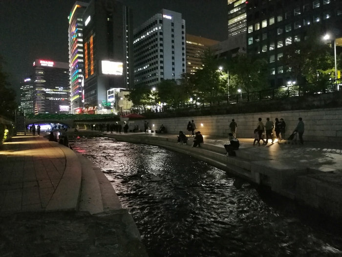 Добралась я до него уже в сумерках, Чхонгечхон встретил меня яркой подсветкой и множеством гуляющих горожан и туристов.