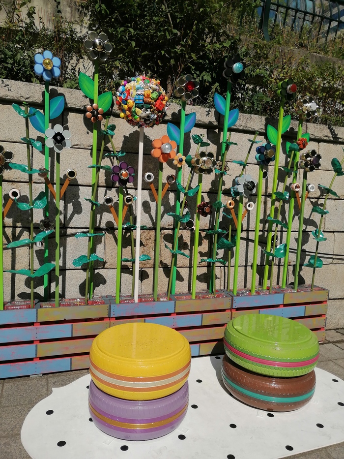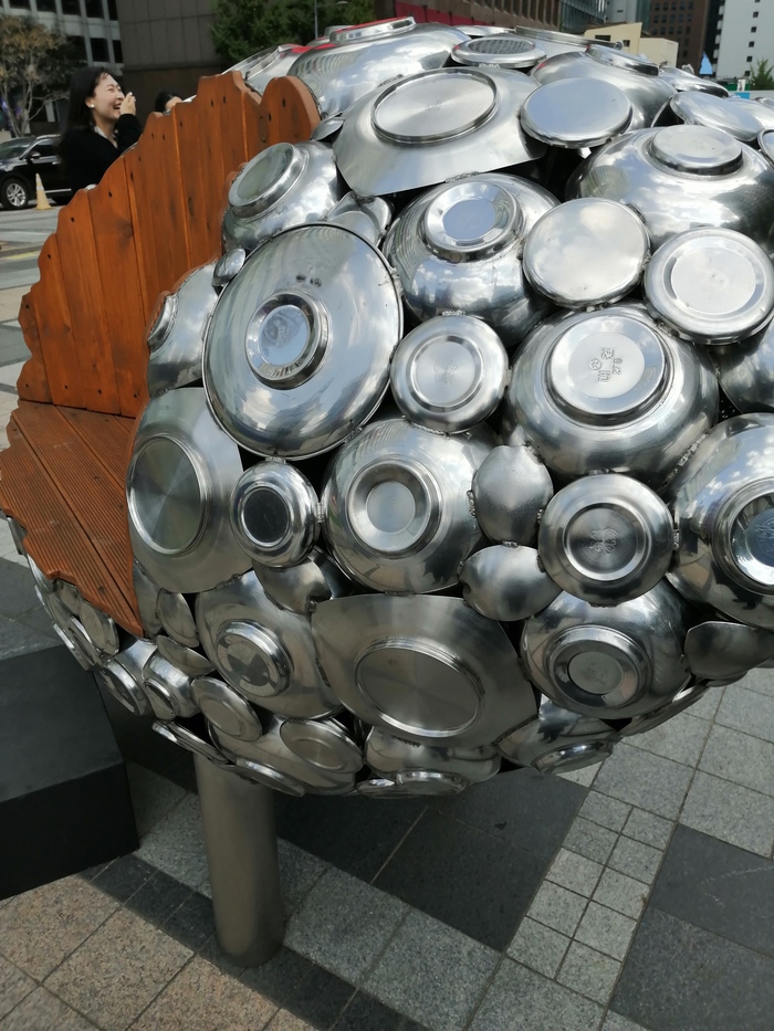 На сей раз Чхонгечхон встретил меня инсталляциями на экологические темы, в частности вторая жизнь предметов. Ниже лавочка из мисок и тарелок.