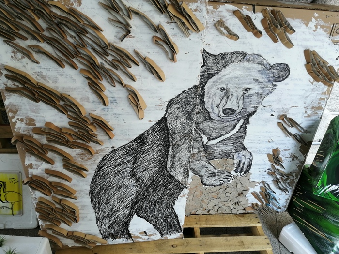 Картины. Было много интересных работ например картины состоящие из линий, наподобие мандалы или фракталов, на самом деле оказались фотоколлажем из фотографий автомагистралей, были изображения зверей из различных предметов.