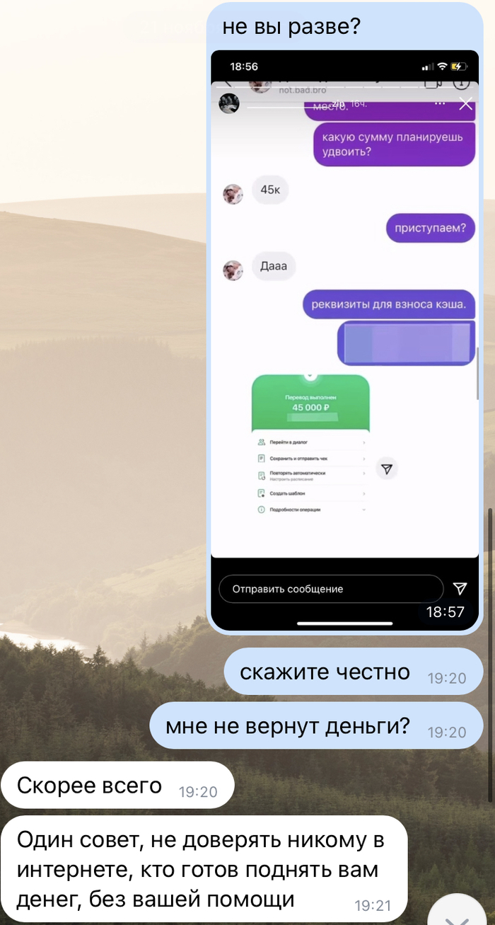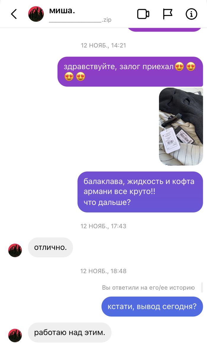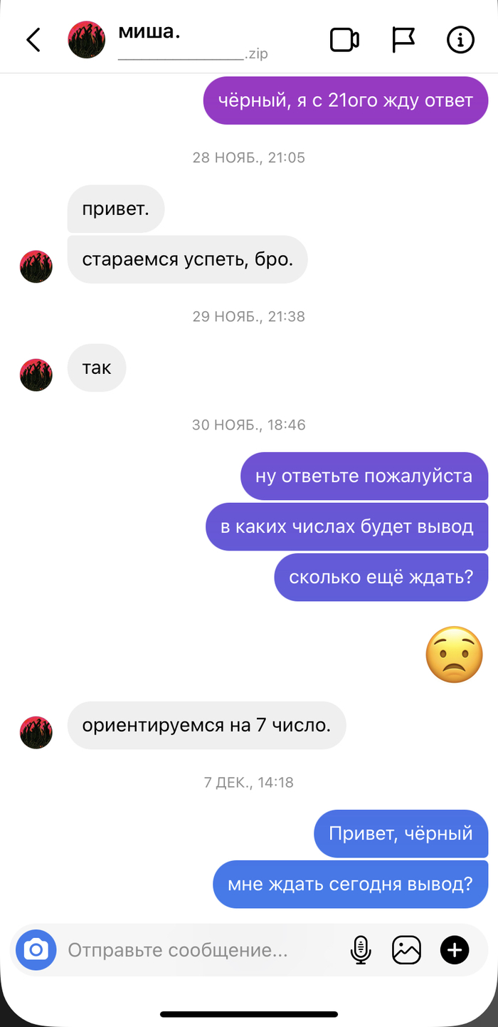 Ребята, будьте осторожны и не повторяйте моих ошибок. Не переводите деньги этим людям. Несколько месяцев назад я решила вложить деньги в их чф 30 тысяч, «удвоить сумму»(см. фото) . В залог мне пришла кофта (паль, либо по скидке выбили), жидкость, карта и балаклава. Договаривались на 48 часов, но ответа не было. Решила подождать до 17 суток(см. фото), но видите ли у них задержка курса и прочее. Смешно. Дальше полнейший игнор, холодные ответы ассистентов, потом узнается, что некоторые отзывы просто попросили разыграть. Пишите в телеграмм @aldisodn
