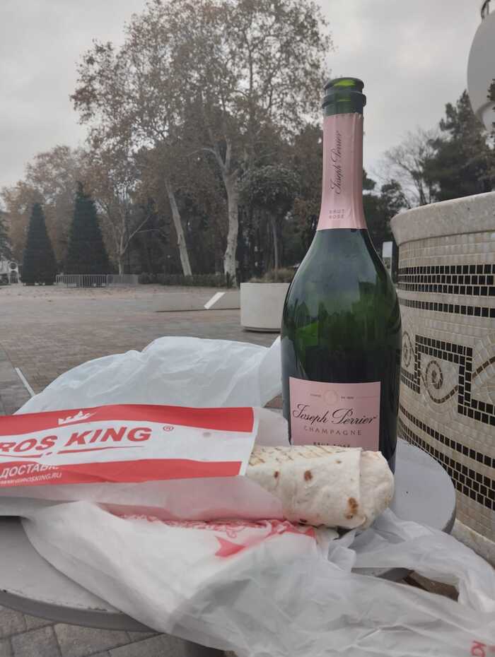 После дегустации. Я по ещё одной ежегодной традиции забрал один из образцов для теста с интересной гастрономией. Есть даже клуб в США, члены которого пробуют игристое со всем и ищут новые грани. Следуя заветам Мерлин Монро, которая обожала шампанское вместе с картофельными чипсами. Благодаря им, бургеры и розовое игристое стало уже классической гастропарой. Из мной опробовано было сочетание бургеры, селёдка под шубой, чебурек, пирожок с печенью, пирожок с картошкой, хот-дог, картошка фри. И оно всё подходило. Но в этот раз — новое, шаурма. Идеально соединилась с шампанским.