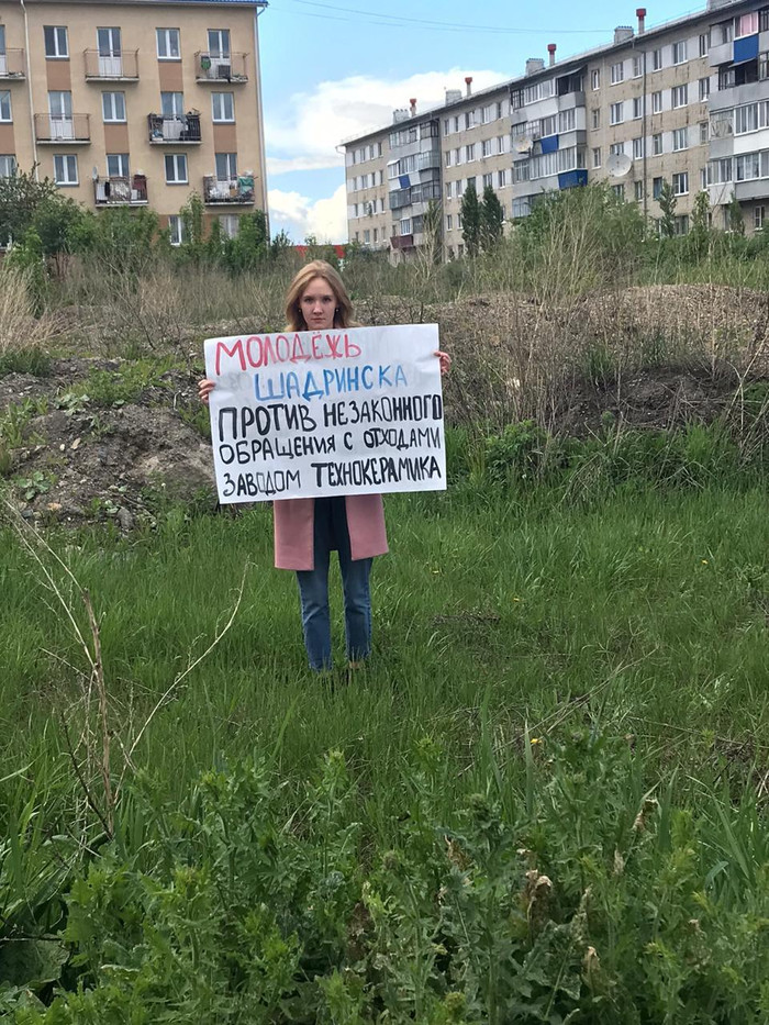 В руках общественница держала плакат со словами: «Молодёжь Шадринска против незаконного обращения с отходами завода «Технокерамика».