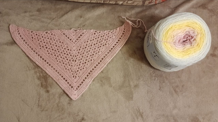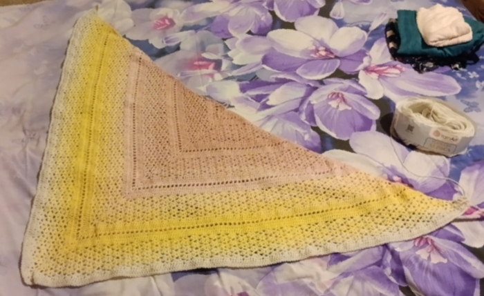 За счёт большого крючка и толстой пряжи вязание шло бодро и быстро, буквально за неделю шаль была почти готова, но что-то пошло не так и клубок кончился... Пришлось заказывать ещё один такой же и у него уже брать начало с внешней стороны, чтоб градиент был ровный, без лишних перепадов цвета.