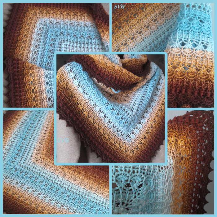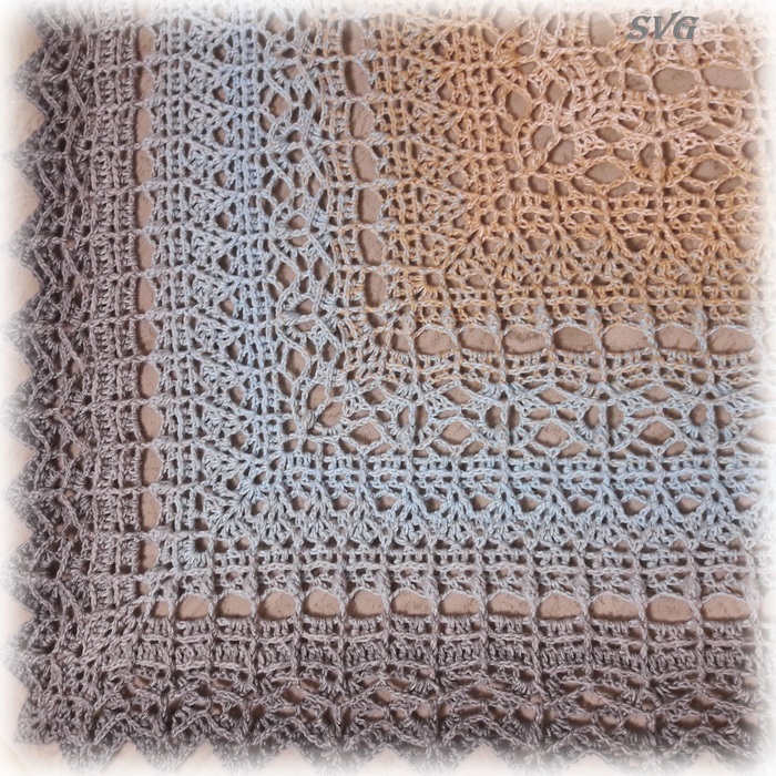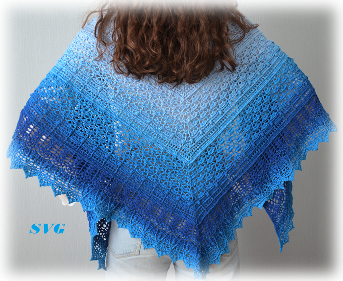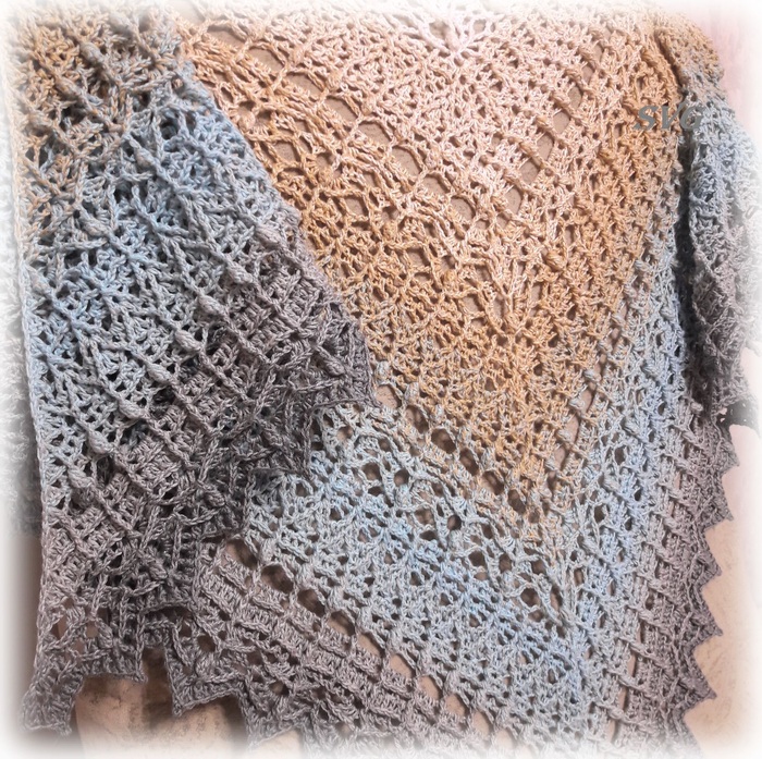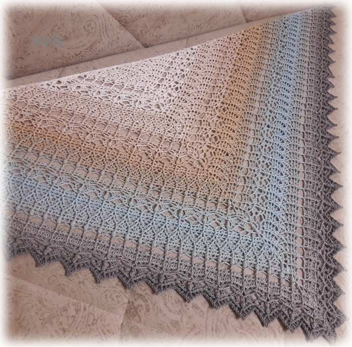 Кто знаком с моим творчеством - знает, что каждой своей шали я даю имя. Эту я назвала Эйра, что в переводе с валлийского означает снег. На мой взгляд очень подходящее имя для шали в таких оттенках.