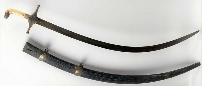 Шамшир середины XVI века. Стальной клинок исписан цитатами из Корана, повествующими о царе Сулеймане(Соломоне, том самом): льстивая отсылка к Сулейману Великолепному, во время правления которого сабля была изготовлена. Покрытая кожей ската рукоять - позднейшее дополнение. Гарда когда-то была украшена мелкими рубинами.