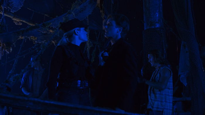 Всё же поспев (и как она добралась до палубы, не промочив ножек? расстояние до борта от причала о-го-го какое!) на судно, она буквально сталкивается с красавчиком Джонни, из рук которого опять вылетает его драгоценный багаж: