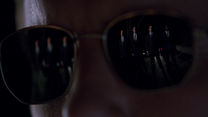 И — вперёд-вперёд-вперёд, галопом! Теперь мы в Городе Ангелов, где, несмотря на жару, имеющую мало общего с разгаром лета в средней полосе России, очень серьёзные мужчины собираются устроить разборку, не снимая отличного покроя костюмов-двоек. Разборка намечается с видимым преимуществом одной из сторон: четверо парней с оружием ближнего боя — и против гордого одиночки. Тоже, разумеется, в костюме прекрасного покроя, а также обладателя очень стилёвых солнцезащиток (и просто неимоверной харизмы):