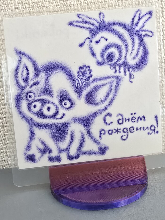 В мае месяце история рисунка получила развитие… Приехал в гости к другу, сидели на дому, общались. Рассказал ему о своей первой картинке в подарок. А он на днях купил себе 3D принтер. Возникла идея изготовить для рисунка устойчивую подставку. Мы нашли в интернете модель с подходящими размерами и за 1,5 часа её отпечатали. Пыхтит принтер «Flying Bear Ghost 6», скользит экструдер, при температуре 200°С плавится нить (Crown pla silk «cm-filplasd010rp»):
