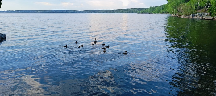 Гулял сегодня после работы один по берегу озера Шарташ, что в Екатеринбурге. Рядом плыла семья уточек, начал её снимать. Конечно ими ещё и заинтересовались дети, гуляющие с 2мя мамами. Мне кажется, что вопрос детей я понял раньше мамочек.