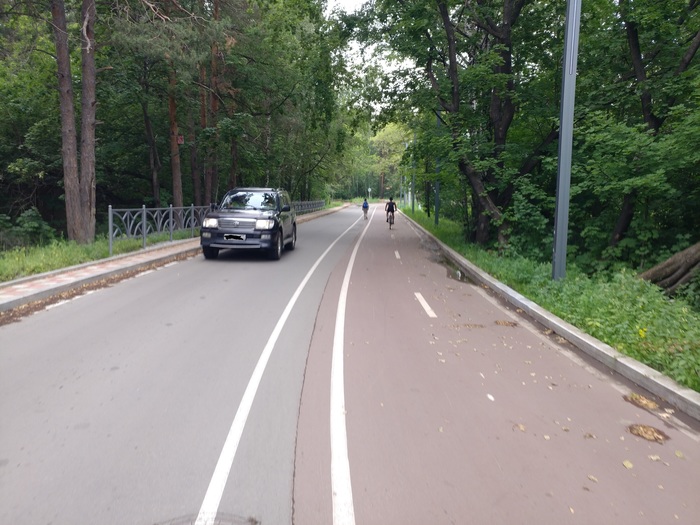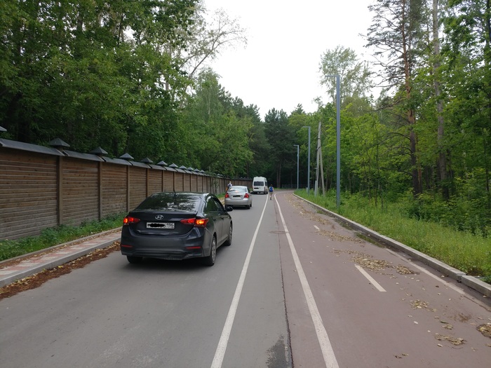 Да-да, вам не показалось, вот эта широкая часть слева и есть та самая пешеходная дорожка! Правда по ней идёт непрерывный трафик автомобилей и заходить на нее пешеходы не могут. А справа действительно велодорожка, тут никакого вранья. И вы только гляньте, с каким же комфортом теперь можно гулять, когда с одной стороны в метре от тебя проносятся машины, а с другой - велосипедисты (по центру именно пешеходная дорожка, там через каждые 5