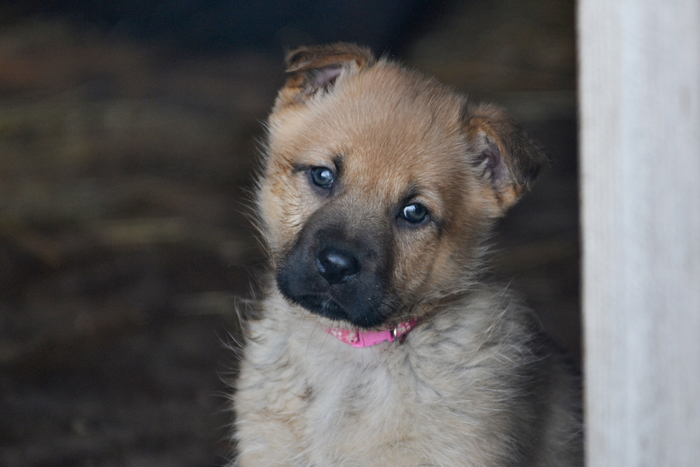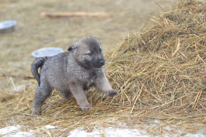 Найка никуда не убегает, хорошо заходит на место. Вполне ужилась с Уитни и Бароном. Вот только в будки не залезает, хотя их там шесть на три собаки. Найка спит на сене на будках.