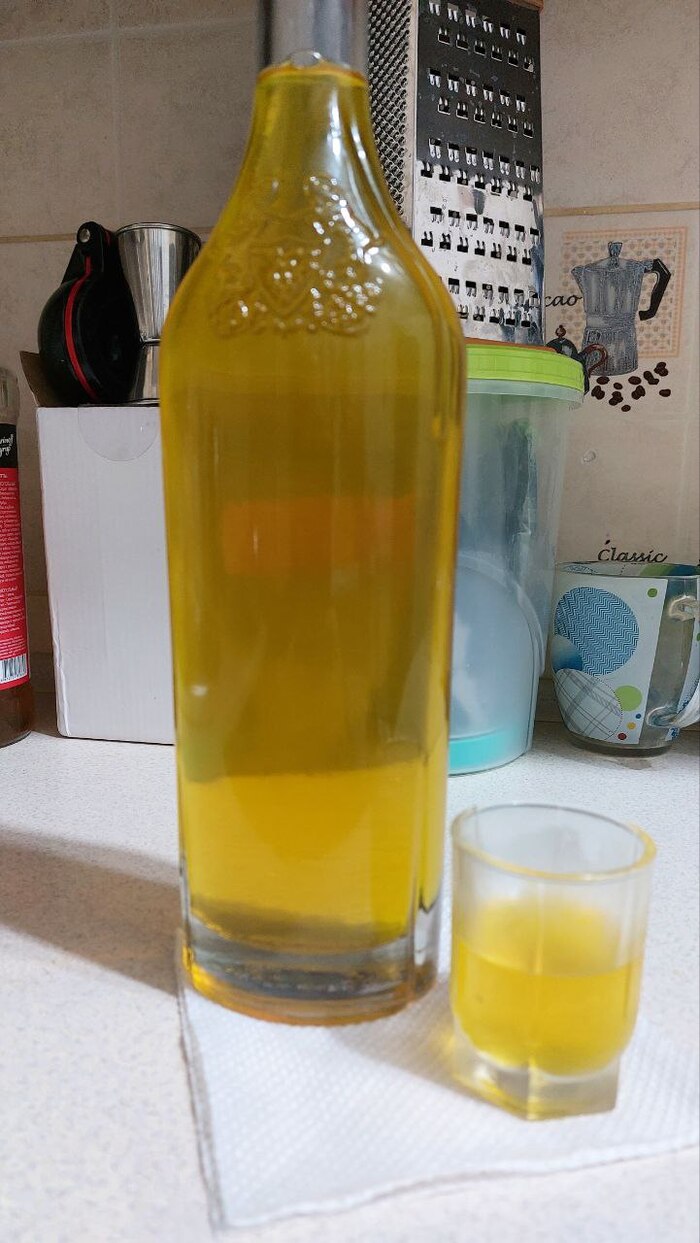 Затем сварил сахарный сироп. Остудил его до комнатной температуры и смешал с настоем. Дал ликёру "отдохнуть" 3 дня, профильтровал его и разлил по бутылкам.