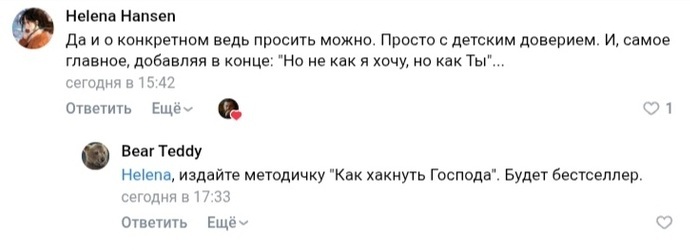 Первой комментарий к посту Нектария оставила Helena Hansen. Она оспаривает призыв Нектария не концентрироваться на мольбе о "чём-то конкретном, а лучше просить о том, чтобы быть с Богом", утверждая, что можно и о конкретном, если "завернуть молитву для Бога в другую упаковку".