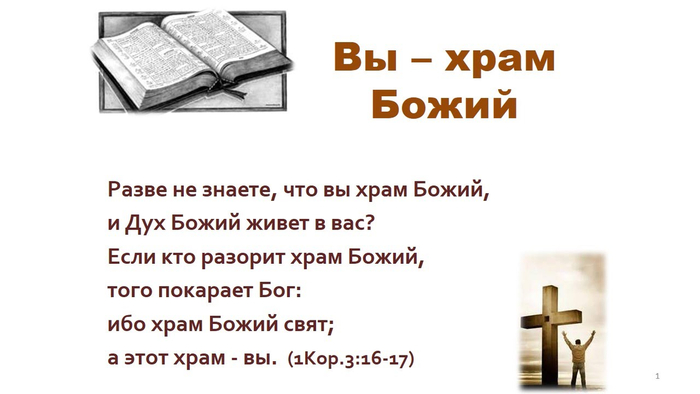 Несмотря на серьезные препятствия и испытания, иудеи эпохи Зоровавеля благодаря Господу и вере в Него завершили возведение храма. А воздвигли ли мы в своей жизни храм Богу? При этом нам не требуется приобретать камни и раствор, выкупать землю, добиваться разрешения от властей. И все же храм, который Бог ожидает сегодня от каждого, не менее важен в Его очах, чем святилище Зоровавеля или даже Соломона. Об этом особом храме, который мы нередко упускаем из виду, апостол Павел пишет: «Не знаете ли, что тела ваши суть храм живущего в вас Святаго Духа, Которого имеете вы от Бога, и вы не свои? Ибо вы куплены дорогою ценою. Посему прославляйте Бога и в телах ваших и в душах ваших, которые суть Божии» (1Кор. 6:19-20). «Разве не знаете, что вы храм Божий, и Дух Божий живет в вас? Если кто разорит храм Божий, того покарает Бог: ибо храм Божий свят; а этот храм — вы» (1Кор. 3:16-17).