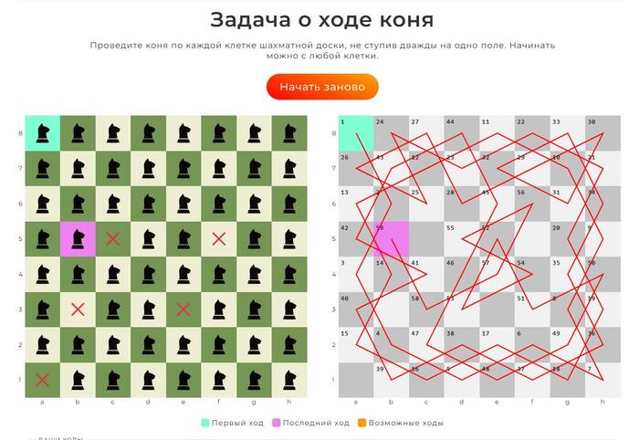 Наткнулся на интересную шахматную задачу и решил сделать сайт 👉 лошадьюходи.рф. Проект не коммерческий, потому прошу модератора пропустить. На сайте котором каждый может попробовать эту задачу решить! Напишите получилось или нет в комментариях (присылайте скрин) 🖐 Мой рекорд 59 клеток