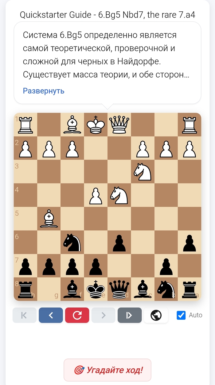 Если вы хотите проверить свои знания и потренироваться играть за чёрных в варианте Найдорфа, попробуйте интерактивный тренажёр по ссылке: https://memo-chess.ru/training/openings+stockfish/Najdorf/0