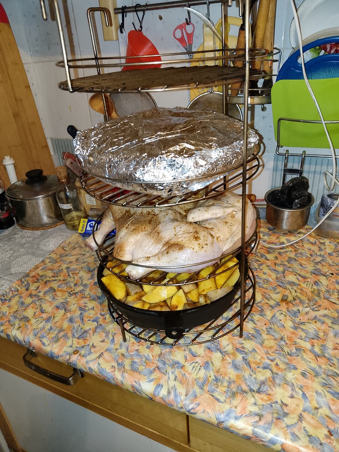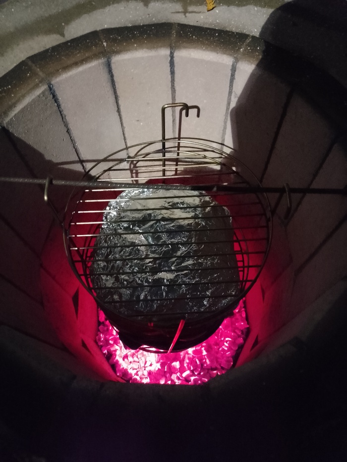 Тем временем у нас уже готова первая закладка: сковорода с картошкой; тушка курицы, маринованная в соевом соусе и говяжья грудинка, обёрнутая в фольгу и замаринованная аналогично курице. Вообще говяжью грудинку в тандыре не готовят, но тёща взяла её со скидкой и подсунула мне в последний момент.