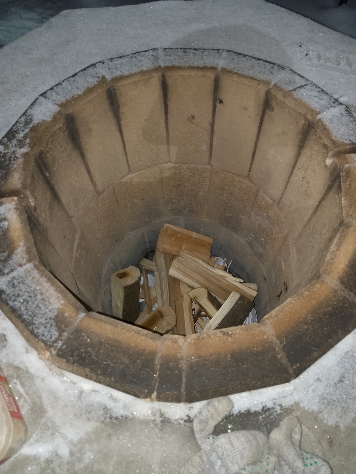 Расчистим тандыр от снега и заложим первую порцию дров: