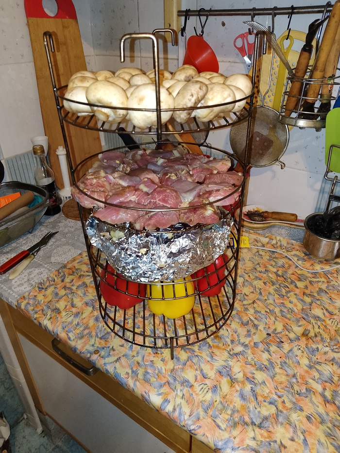 Готовим вторую закладку: перцы целиком без сердцевины; та же говядина; шашлык из индейки, маринованный просто с луком, солью и специями и шампиньоны просто целиком.