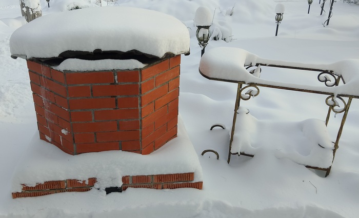 Итак, Новый Год на дворе и пора воспользоваться преимуществами стационарного тандыра, а именно его круглогодичной готовностью порадовать нас вкусным мясом и не только! Вот он наш герой, стоит одиноко занесённый снегом: