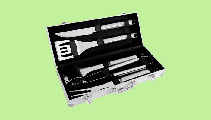 Чтобы приборы не терялись и всегда были под рукой, храните их в одном месте. Удачный вариант — набор из нержавеющей стали в металлическом кейсе. Вилка, лопатка, щипцы и нож помогут управиться с мясом, а щетка — почистить решетку после готовки.