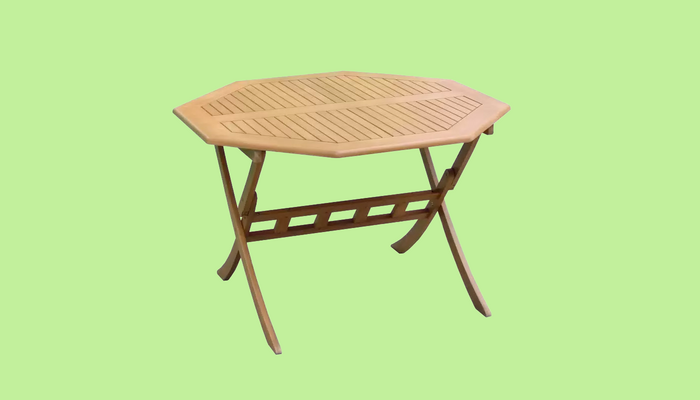 Даже в скромной шашлычной зоне можно позволить себе большой стол, если он складывается. Оригинальная форма столешницы позволит удобно разместить 6-8 человек, ее размер — 120 см.
