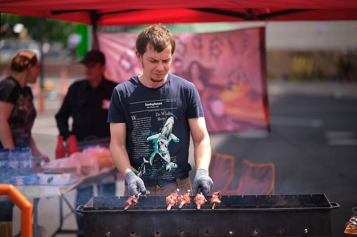 Да так вышло что мы работали и на веганских мероприятиях, хоть и основной наш продукт это всё-таки шашлык из свинины и куриные крылья, но овощи и шампиньоны всегда в наличии с румяной корочкой)