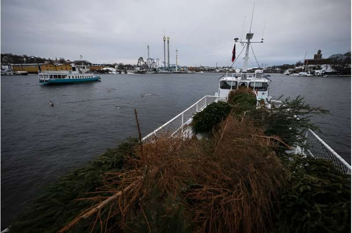 Еще несколько дней назад величественные норвежские ели занимали почетное место в уютных домах по всему Стокгольму. Теперь мишуру и украшения заменяют тяжелыми камнями, после чего деревья сбрасывают с лодки в воды промышленной зоны Хаммарби Сьостад.