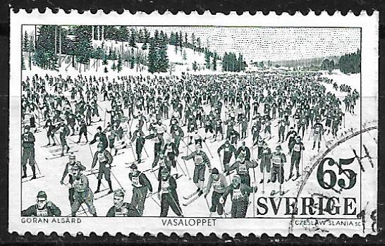 А эта одна из самых знаменитых его марок. На ней – сам автор. Один из лыжников в крайнем, ближайшем к зрителю ряду. Так художник поступал неоднократно.