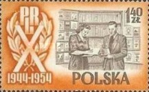 Вот, например, польская марка 1954 года. На корешках книг непросто разглядеть надписи. Микротекстом на них написаны имена близких людей художника. Родственников, друзей.