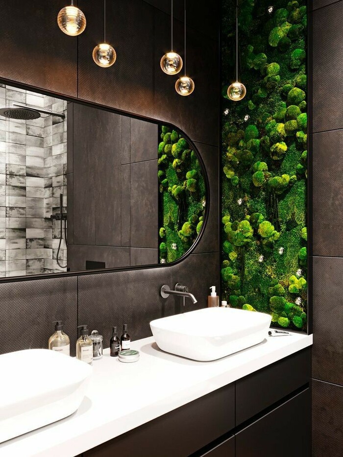 Мох — это один из немногих декоративных элементов, который отлично чувствует себя в условиях ванной. Он не боится влаги (в пределах нормы), не требует света, и его легко вписать даже в лаконичные монохромные интерьеры.