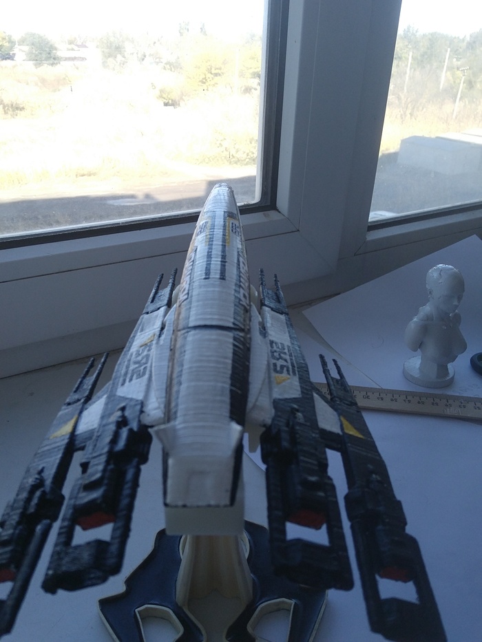 Выполнен из пластмасс PLA И ABS, а именно подставка PLA, посадка для корабля на подставку из ABS, сам корабль из PLA, дно подставки залито эпоксидной смолой с черным колером.